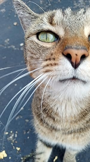 Days later, I was petting Baby in the parking lot when a juvenile squirrel, with little experience dealing with the feline crowd, was nosing around for something to store away for winter, and paid no mind to the lurking presence of Baby nearby.
