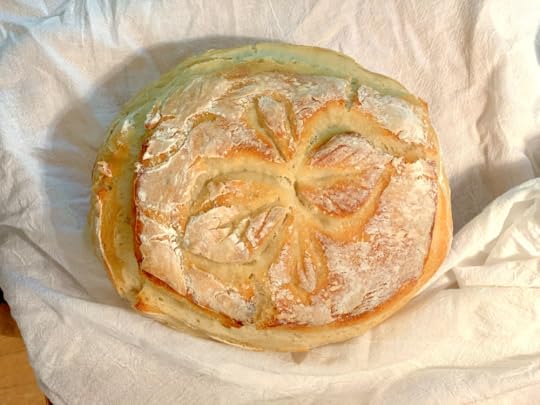 We have a routine. My daughter prepares the dough at night. She’s a night owl and I turn into a pumpkin at 9pm. The dough rises overnight, and when I am up in the morning I do the final folding, chilling, scoring and baking. By the time everyone lumbers downstairs mid-morning, a golden brown loaf is cooling on the cutting board for lunch. Someone (he knows who he is) usually cuts off a heal before anyone else even gets to it.