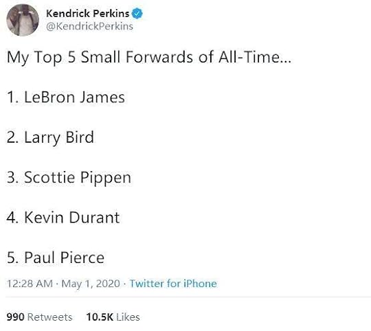 该排名甫一出来,就引发了热议,小托马斯点评道:你的小前锋排名极差!不过帕金斯回复道:关键词是我的,你也可以评出你心中的。确实如何排名这本就是仁者见仁智者见智的问题,接下来我们综合荣誉、数据等因素,相对客观的来聊下这个榜单吧。
