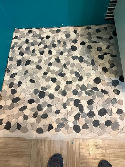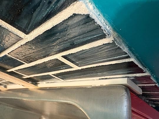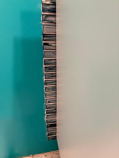 On Thursday, I got the last bit of backsplash up near the fridge. It is composed of leftover bits from the rest of the backsplash work on the sink side. The sink area needs the same treatment, but it’s accessible and my fridge needs to get out of my music room. The picture I took after putting them up allowed me to see that a couple at the bottom were not in line with the rest and I was able to adjust them using my level.
