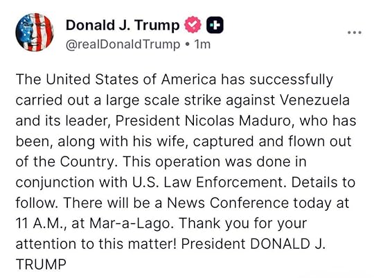 Kegiatan jenayah antarabangsa Amerika Syarikat ini kemudian diumumkan oleh ketua penjenayah mereka Donald J. Trump di mana dia telah mengumumkan secara rasmi bahawa Amerika Syarikat telah menyerang negara berdaulat Venezuela dan menculik presidennya, Nicolas Maduro. Kegilaan jenayah Amerika Syarikat dibuat tanpa perasaan malu di mana Trump turut menyatakan beliau turut menculik isteri presiden Venezuela.