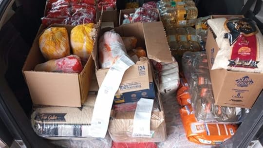 With only about $40 from donations, we were able to get enough food for them to eat for a few weeks. We bought 7 kilograms of rice, 4 kilograms of beans, more than 3 kilograms of noodles, cooking oil, salt, sugar, 3 kilograms of hot dogs, tomato sauce, toilet paper, a big chicken, toothpaste, tangerines, onions, garlic, mozzarella cheese, lunch meat, mayonnaise, bread, potatoes, soap, and more.