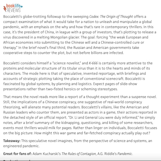 “This speculative novel imagines, from the perspective of science and systems, an engineered pandemic.” — BookLife Reviews