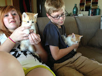 In July, Doug came across a small litter of kittens in the shed. One particular kitten, the scrawniest of them, had a certain intrepid sense about him. Rather than hide from the humans, he'd come jaunting out of the weeds to say, "Well hello there!" The rest of the litter stayed more aloof, only inching out whenever Doug dumped out some cat food he lovingly purchased (and still purchases) at the feed store.  As you'd guess, this seemed to solidify our new friendship with scrawny cat. But Doug gave me very specific warning. "Don't you go picking it up. We want them all to stay wild."