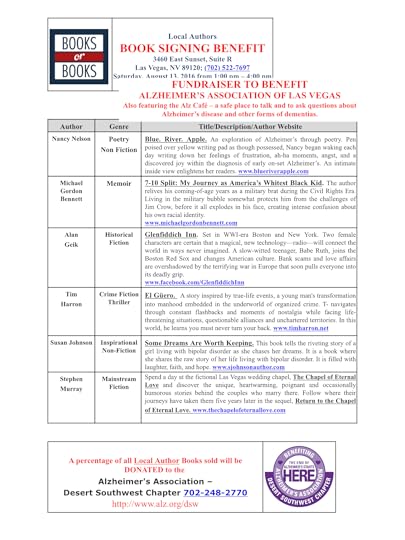 I'll be participating in a benefit for the Alzheimer's Association of Las Vegas. Myself and other local authors will be signing our novels and donating a portion of our book proceeds to this amazing cause. Thank you to Kim Henry Nancy Nelson for spearheading this event. I encourage all my friends to join us atbooksorbookson August 13th from 1pm- 4pm.