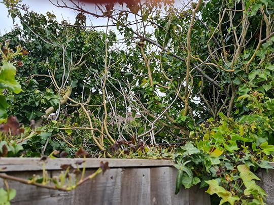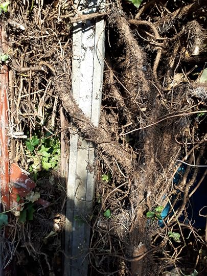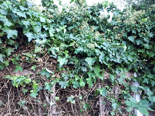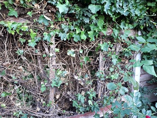 This is the height of the ivy in my next door neighbours’ garden, there is a tree in the foreground This, and the following, show the ivy I cut down a couple of years ago That is a concrete fence post being hugged by the ivy