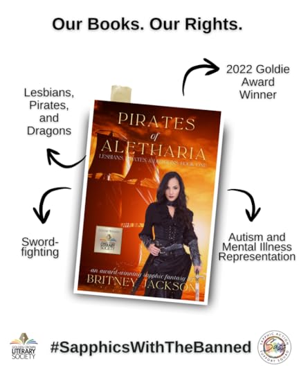 Image: Sapphic September bingo card on rainbow background with the covers of Pirates of Aletharia (Lesbians, Pirates, & Dragons: Book 1) and Goddess of the Sea (Lesbians, Pirates, & Dragons: Book 2) by Britney Jackson.Text: Lesbians, Pirates, & Dragons.• Disabled Sapphics• Indie or Small Press Author