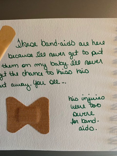 The next two pages that I want to share are heart-wrenching. Young parents should buy stick in band-aides, they are used constantly. I hated to see my children hurt, but when they would come to me with a boo-boo and want me to kiss is and cover it with a band-aid my heart just melted. I loved being there for my children and that was a symbol for me of my presence and care for them. They were also a symbol of the child who's boo-boos I would never be able to kiss and make better. I will never hear his cries and I will never be able to help him through his hearts. He is gone and will never return to me. I made the "choice" and I will live with it every day of my life.