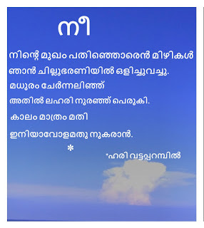 നേരം വൈകിയ നേരത്ത് തിടുക്കത്തിൽ നടന്നു പോകെ ,പോക്കു വെയിലിൻ തങ്ക നിറവും കണ്ടില്ലയാൾ .......