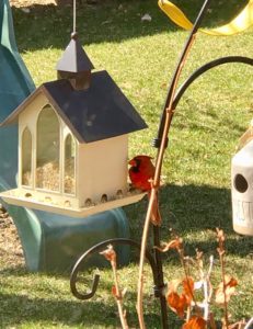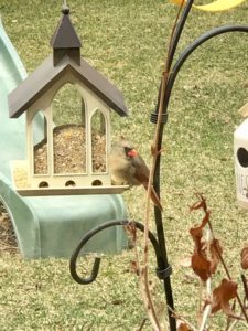 This year, cardinals have been keeping me company. I’ve read that cardinals mate for life, and I always wonder if the same cardinals return every year or if they’re new birds. Here are the male and female at my bird feeder.