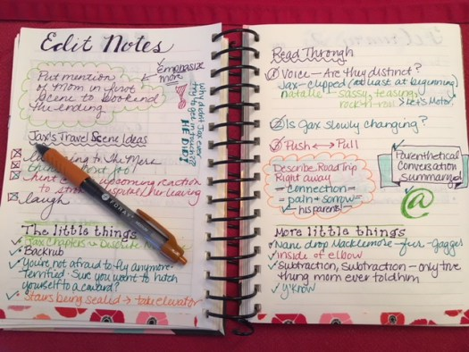 A month or so ago, I was deep into first-pass editing. This is the stage after you receive an editorial letter that poses questions about character development, suggests adding scenes (or removing them), and encourages other “big picture” thinking. I posted a photo of what my editing process looked like for that morning, and Therese Walsh messaged me: “Please write a post about this.”