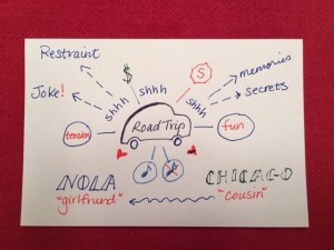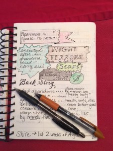 I often use check boxes, or dialogue bubbles. Sketching my ideas helps me “see” them and think about them—sometimes staring at a wall for half an hour is my most productive writing time. The goal is to ultimately understand my ideas well enough that I can describe them to someone who hasn’t seen the picture before.
