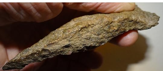 “Look,” David said (always his first lesson!). He fingered the clearly sharpened edge (above, right), and the worn-in little “cup” just behind it, exactly where a forceful thumb would fall in years of prying open clams or tanning a deer-hide. (The pointed left end too would find many uses.) He judged it Early or Middle Archaic, or roughly 11,000 to 8500 years old. Still here? In such a built-up area? “So are the Native peoples,” he smiled. “Some of the oldest finds are from close-by places ploughed up for golf-courses. They didn’t carry stone tools around, but left them where they used them in common. That also partly explains the spectacular ‘tool-kit’ found right near here, in Caddy Park. Here, Jack—you keep it for us.” I still do.