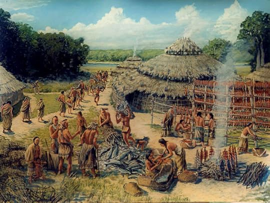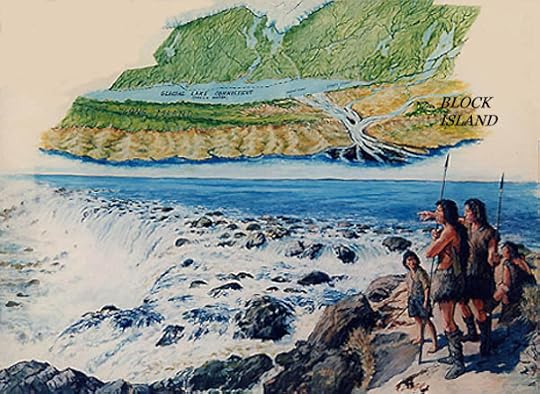 Above, part of David’s history of New England just after the Ice Age, with a seaboard waterfall 60 times the scale of today’s Niagara (see “After the Ice” at Ancientlights.org). In those days of low sea-levels the region had over 250,000 more square miles of dry land, oral history told of people walking to visit relatives on Nantucket, and fishermen still dredge up teeth of mastodons. Below, David’s concept of a Middle Archaic village with spiral-form wetus.