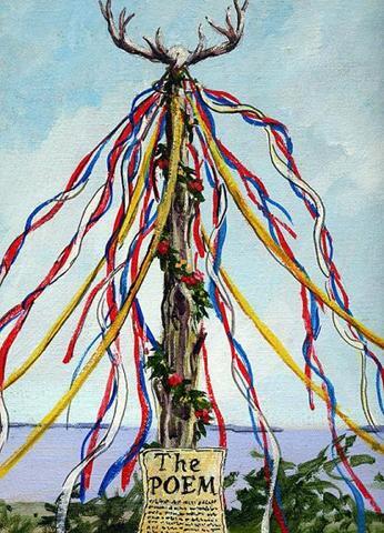 Meanwhile, as my edition of Morton’s Canaan neared publication (2000), I showed David a detailed design for the book’s cover, which he turned into the painting below. “And there it stands, as a fair sea-mark,” to paraphrase Morton, “how to find the way to Mine Host of Merrymount.” Never again will American Puritans chop it down, nor denigrate Morton’s manifold achievements at the foundation of our multicultural frontier—not least, his documented standing as America’s first poet in English, whose work envisioned a country of respectful coexistence and compassionate cooperation. Enjoy the raucous Revels dance and music still going on at the site of Morton’s trading-post!