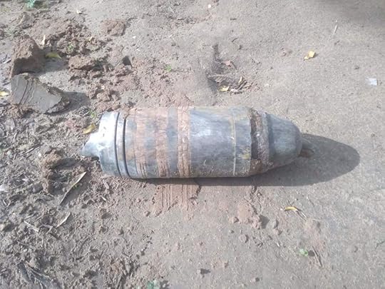 This Israeli artillery shell landed 12 days ago in the yard beside Muhammad’s house in Balah. It is still lying there between the Israelis who fired it and the Hamas thugs who want it for a new weapon—both of them interfering with experts who might be able to remove it.