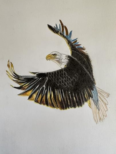 Picture caption: Hand drawn picture of Ethan the EagleI love this picture because the bald eagle is so regal. These birds are indigenous to North America so I had to research it to in order to create the drawings. Bald eagles are sea eagles and are believed to be a sign that divine guidance is near. The bald eagle’s fierce nature and hunting prowess symbolise strength, courage, and perseverance.