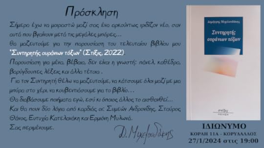 Με χαρά δέχτηκα την πρόσκληση του ποιητή και σκιτσογράφου Δημήτρη Μιχελουδάκη και θα συμμετέχω στην παρουσίαση της ποιητικής του συλλογής με τίτλο ''Συντηρητής Ουράνιων Τόξων''. Η παρουσίαση θα γίνει το Σάββατο 27 Ιανουαρίου στις 19:00 στο καφέ - βιβλιοπωλείο Ιδιώνυμο στον Κορυδαλλό (Κοραή 11Α). Σας περιμένουμε όλους εκεί!