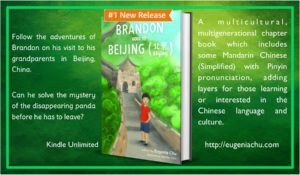 Brandon Goes to Beijing (北京) is my award winning chapter book. This book is for older kids, grades 2-5. It’s all about Beijing and a mysterious little panda! You can learn more about this book by clicking the “About Brandon Goes to Beijing (北京)” tab in the Menu to the left.