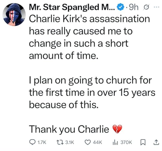 This First Sunday After Charlie Kirk’s DeathLike many of you, fellow believers, I have been reeling from the news of Charlie Kirk’s death. I knew about him and followed him after my own children recommended him to me last year. He is the best example I can think of a Christian who spoke the truth in love (Eph. 4:15). Now my children and I are uniting together to #belikecharliekirk.