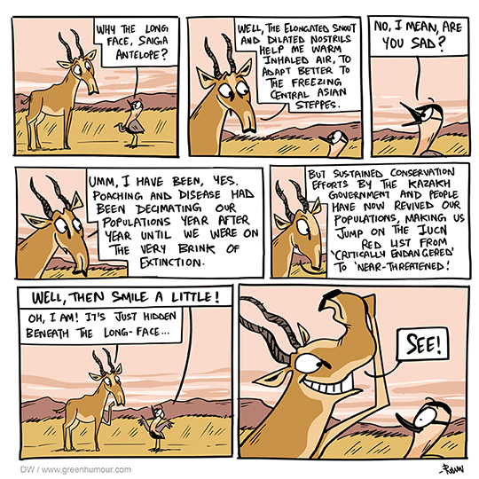 If you too have had a long face reading about the decimation of the Saiga Antelope's populations from hunting and disease over the years, there's some news that might bring a smile to your face too! Efforts by the Kazakh government, NGOs and people have paid off enough to bring the Saiga from critically endangered to near-threatened on the IUCN Red List. In these times, that's a long jump, even for an antelope!