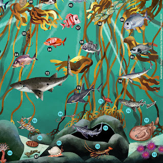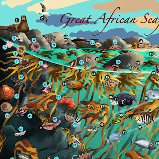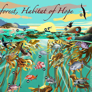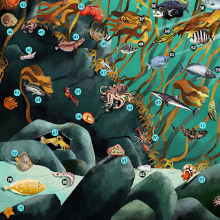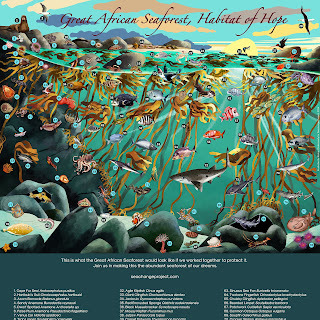 (Click on the image for a larger view)In one of my lengthiest and most detailed illustration projects yet, I got the honour of working closely with the fabulous team at The Seachange Project (creators of the Oscar winning documentary 'My Octopus Teacher')- to create a vision of hope for the Great African Seaforest, a vast expanse of kelp forest in the Atlantic Ocean along the western coast of South Africa. From the glamorous Cape Fur Seal, Cape Clawless Otter and the African Penguin to little known klipfish and limpets, the Great African Seaforest is home to a myriad marine organisms that make the kelp a living, breathing, and a dancing ecosystem! Many of these creatures are threatened by overfishing and anthropogenic disturbances today, and conservationists at the Seachange Project are working towards establishing safe, undisturbed habitats for these species to bounce back.