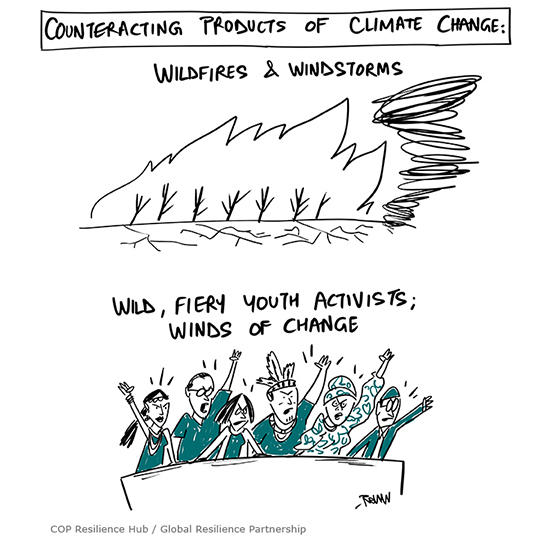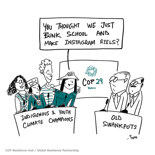Cartoons from a session on indigenous and youth activism at the Cop Res Hub, 11th November 2024.