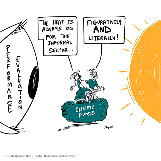 Cartoons from a session on financial innovation for climate aid for informal sectors, with speakers from SEWA and Atlantic Council, 12th November, 2024.