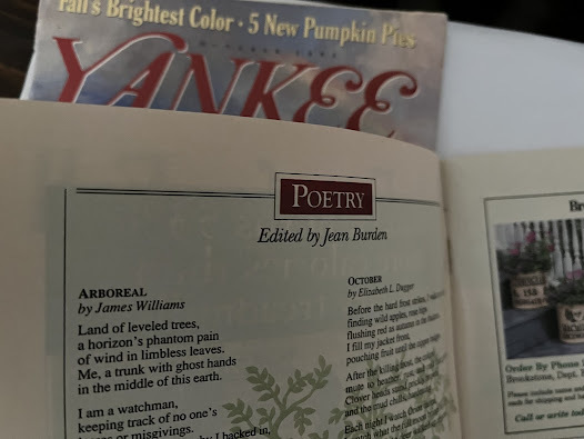 My first published poem, "October," came out in YANKEE magazine -- which meant a lot to me (and still does), because more than any other, this magazine captured what my mother loved and valued. In the enormous gap that her premature death left (she was only 53), I could at least feel that she saw my poem this way.