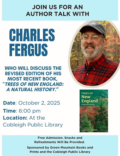 Will you be within driving distance of Lyndonville, Vermont, on October 2? As the poster here shows, there's a great opportunity to meet this thoughtful and knowledgeable author at the Cobleigh Public Library there, and to hear more about his observations of the trees that surround us.