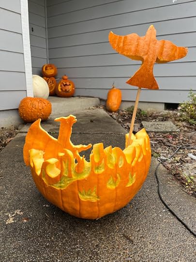 This year’s Pumpkin A is a scene of fire, fury, and ferociousness, as two creatures of flame—a dragon and a phoenix—fight it out for Halloween supremacy. With intricate carving and a truly out-of-the-gourd vision, Carver A has created a landscape that cannot help but ignite the imagination. The scene shows a scorching showdown between Fawkes the Phoenix, sent by the forces of good to steal a precious artifact from an evil dragon, and the dragon herself, determined to protect her hoard. Candles alone were not enough for Carver A this year—instead, they’ve incorporated multiple forms of fire to create a truly explosive vista. Particularly noteworthy are the incredible details the carver has included, such as the delicate feathers on the phoenix’s outstretched wings, the flames carved into the pumpkin base… and, of course, the blowtorch-created jet of flame streaming from the dragon’s mouth. Who will win this blazing battle? Only time—and your vote—can tell.