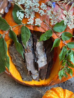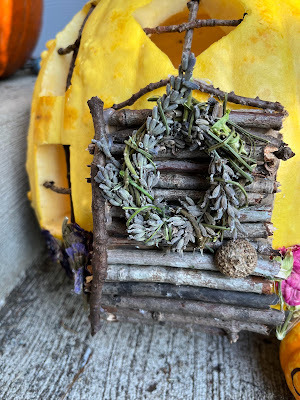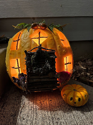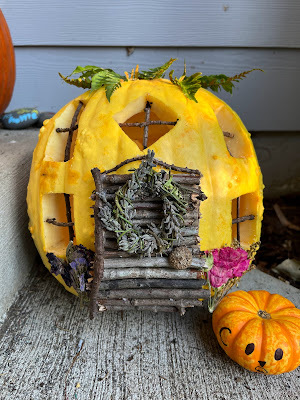 Until they finally found a little pumpkin, and they stayed there for a month, until the storm ceased. They clawed out little windows and a little door, and added sticks, and they hollowed out the inside completely (they had a lot of experience with skulls), and they added some nice flowers for decoration. They made shutters that could open and close, like they sensibly do, unlike all those human houses that have shutters that are just for show (seriously, what is with those?). And they made a circular door out of tree bark.