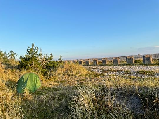 By the time my tent is set up, it’s around 5pm, and I take my valuables with me to the deserted sandy beach that is only about 50m away. I wander in my bare feet for a while, then venture into the sea. It takes me a while to get properly into the cold water, but once used to it, I swim for twenty minutes. For many years, I’ve felt too delicate to venture into the sea to swim, but the success of the wild camping has made me feel more robust, and I’m so pleased with myself to be able to enjoy a bit of wild swimming as well.