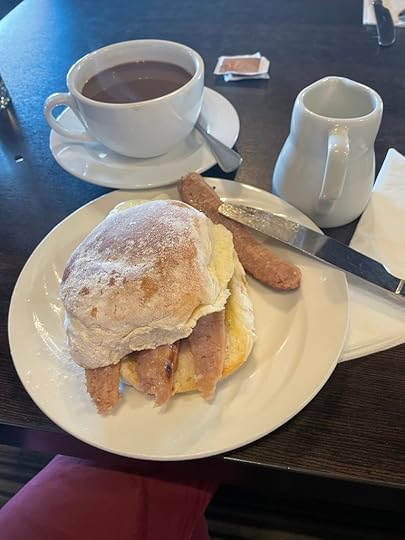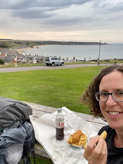 I am aiming to get to Buckie by lunchtime, but arrive at 11am and find a café with electric sockets by each table, so I have a coffee, a large glass of water, some electricity, and fill a few pages of my ‘wild camping notebook’, while waiting for them to start serving lunch at noon, when I have scotch pie, beans and chips. Man, that hits the spot!