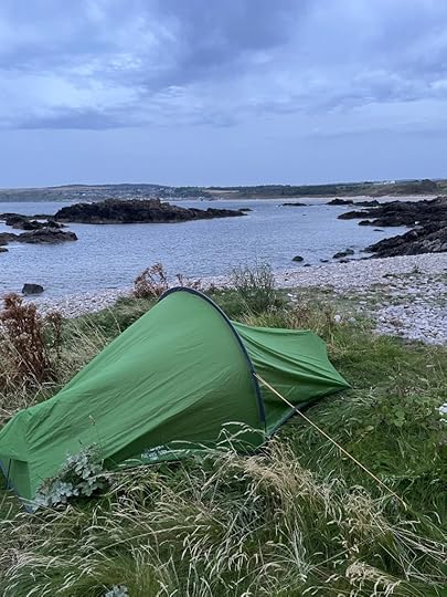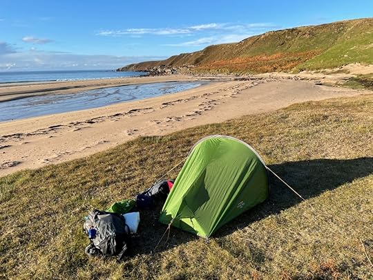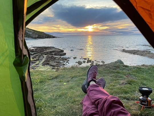 There are various groups of young folk on the beach, having Friday evening fun, including a group of four young men, who I see heading into a cave, beers in hand, at the far end of the beach, very close to where I intend to camp. This makes my vague worries about being alone in the dark crystalise into a more specific and realistic fear of a group of drunk lads. I pass the cave and carry on to the next small cove, hoping none of them will venture that far. I can’t back out of this trip now, and even if I wanted to, I’ve missed the last bus and my car is many miles away at the other end of the trail. I carry on pitching my wee tent with my fingers crossed.