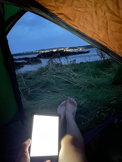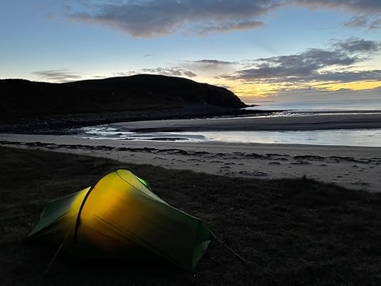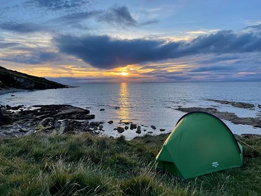 It’s soon getting dark, but still mild, so I make myself a hot chocolate with the Jetboil and drink it as I sit half-in half out of my tiny tent, reading on my kindle, though distracted by the beautiful view across the bay to the lights of Cullen.