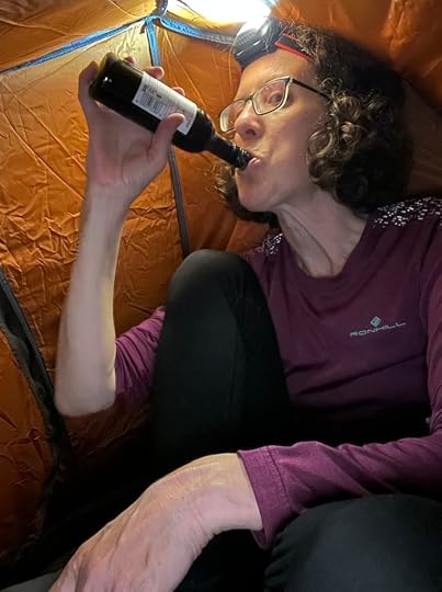 It is a warm evening, and after all my exertions in the woods, and having worn far too many layers from fear of being cold, I sit in the tent sweating, feeling claustrophobic and a bit nauseous from the wine and the smell of the cheese and salami.
