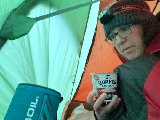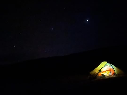 Around 2am my bladder wakes me up; such irony when I had not been able to drink much in the evening as I was preserving water for the morning. I crawl out of the tent to pee, and – wow. I stand there with my jaw hanging open. There’s not a cloud above me, and the night sky is astonishing. The sheer number of stars that are visible is indescribable. I feel like I’m floating in the universe. Time passes as I stand there, in nothing but my pants, soaking it all in. This is what I am here for! To enjoy the startling beauty of the natural world, far from other people. It’s magic. Maybe I’ll keep the tent after all.