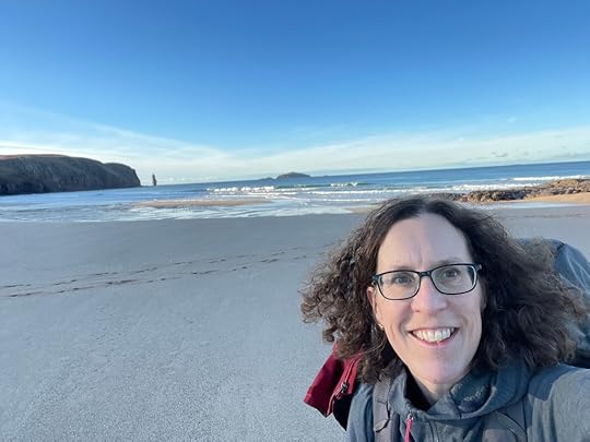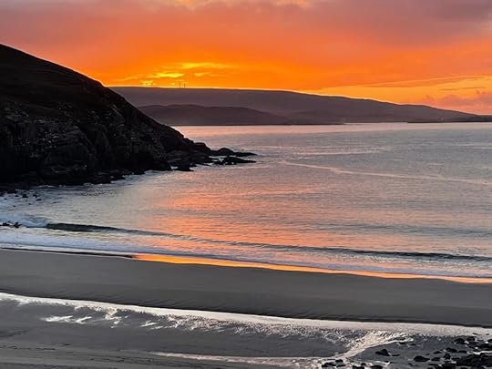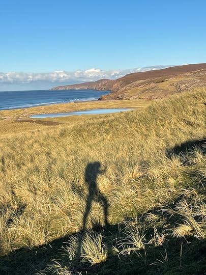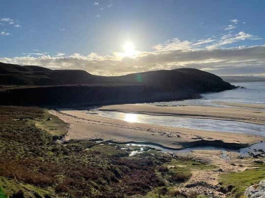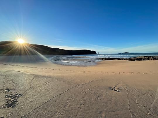 It is mid-November, forecast to be 3c overnight, but the sun is shining in a pure blue sky when I walk the 4 miles across deserted landscape, past a couple of calm lochans. It is a stunning walk, and when I reach the beach, I am taken aback at how large it is, flanked by many metres of sand dunes. I arrive around 3pm, and spend a while wandering about near the water, enjoying the view. There are only two other people on the beach and they leave not long after I arrive. With the sun due to set around 4.30pm, I have this enormous, beautiful beach entirely to myself.