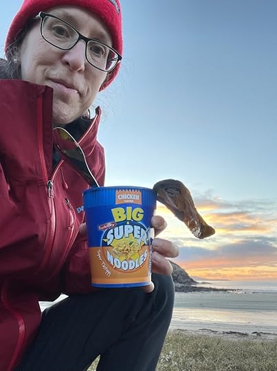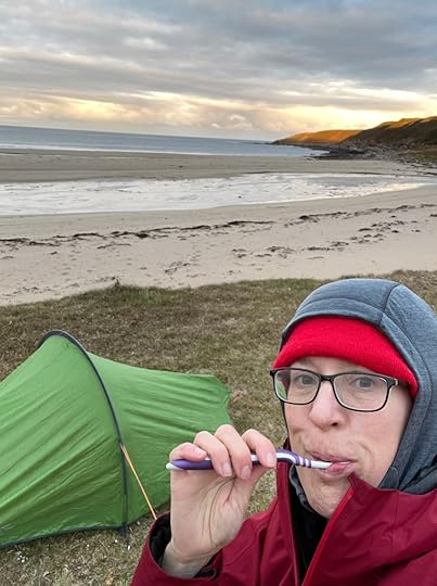 Watching the moon shining on the sea from the cosiness of my -18C sleeping bagI read for a bit, buried in the depths of my sleeping bag, then went outside to watch the moon and soak up the tranquillity of being on my own at the edge of the sea, darkness all around me. It was too cold to hang about for long, and by midnight I was asleep, waking briefly around 3am to rip the heat patch off my stomach as it was so hot, then around 5am, when I made a tiktok, which got 11,000+ views, then slept again until 6.30am, when I made another tiktok, which has since had almost 50,000 views. That’s a lot for me!