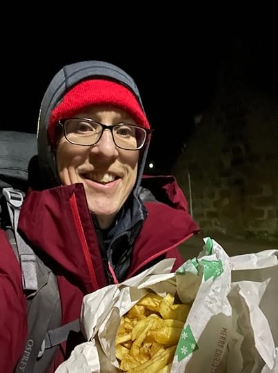 Pitched my tent in the dark!It’s a popular spot, and I hope there is nothing unsavoury on the ground under my tent as I pitch it with the use of my headtorch. I keep misplacing things in the dark, the ground is soaking due to the heavy showers earlier that evening, and my hands are getting cold as the temperature drops. By 9pm, I’m in the tiny tent with my wet rucksack, boots and jacket, changed into my merino wool leggings and top, trying to get warm in my sleeping bag. I ought to make a hot drink with the jetboil but I’m too cold to get out of the sleeping bag. I decide to try to sleep and get up early to continue the walk.