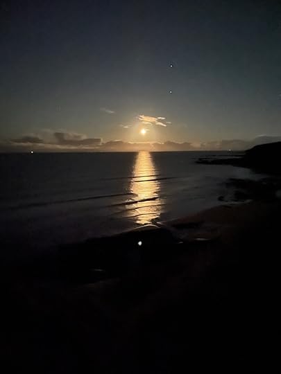 I had the most incredible luck – although it was a cold night, forecast for -3c, there was a clear sky and no wind, and the most beautiful golden moon I’d ever seen. I kept stumbling because I was staring at the moon instead of watching where I was walking. I didn’t have a tripod to get a decent photo of it on a 3 second exposure, so I clambered across the rocky shore, then bent over to rest my elbows on large rock, to try to hold my phone steady. I forgot I was carrying an 11kg rucksack, which had altered my centre of gravity, and I started to fall, first forwards, then overcompensating backwards until I landed on my back on the rocks. The rucksack saved me from any injury but I found myself stuck there on my back on the rucksack, my arms and legs flailing uselessly, like an upturned beetle. I was starting to panic by the time I managed to wrench myself back onto my feet.