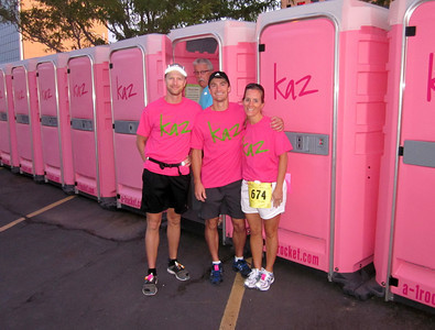The Zimmer family owns the local porta-pottie business, so when my friends Emmet, Julie, and I arrived early for the competitive race, we decided to take a photo in front of the ridiculously pink Team KAZ-labeled potties. They matched our shirts, after all. That rarely happens.