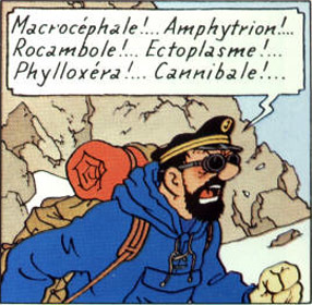 I remember my brother being cut by a bad driver when I was nine and him thundering “Cornichon à Roulettes” (pickle on wheels). My friend and I laughed for hours. And just like that, I saw the genius in Capitaine Haddock’s strings of literate insults (Tintin by Hergé). Here – Bighead, Cukold, a sort of inedible leek, Slime, Pest that attacks grapevines, and Cannibal.