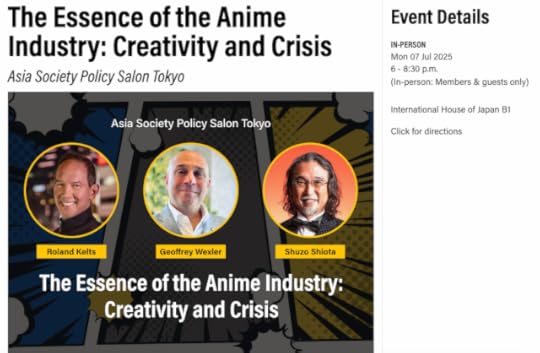 Shot live at International House of Japan, here's the live event video from Asia Society Japan of my presentation with veteran anime industry pros Geoffrey Wexler, formerly of Studio Ghibli and now with Studio Ponoc, and Shuzo Shiota of Polygon Pictures.