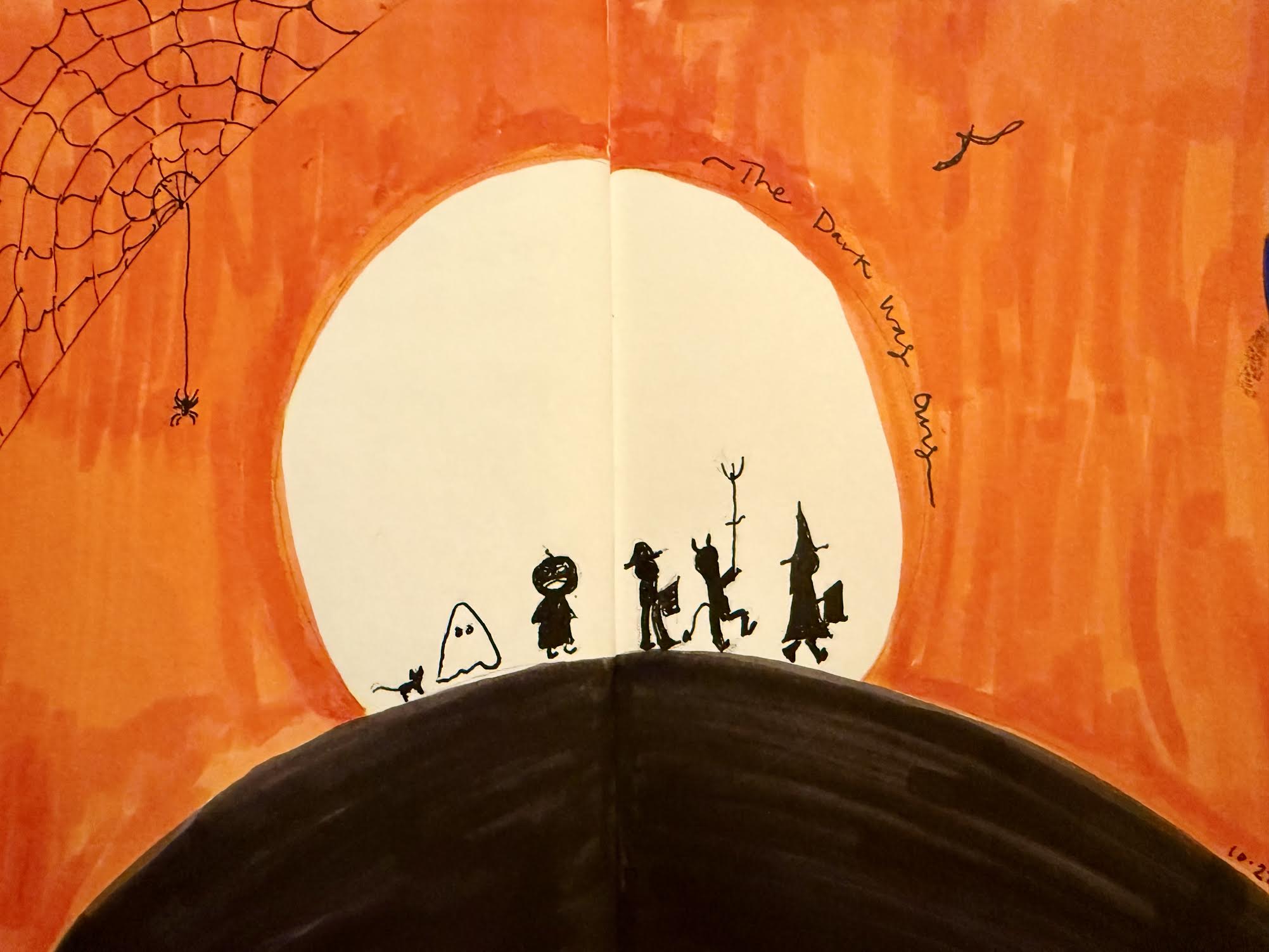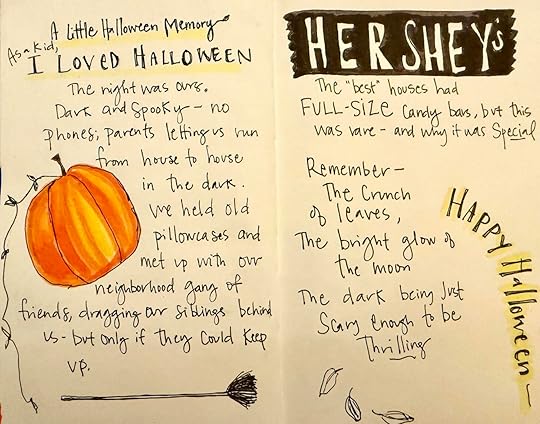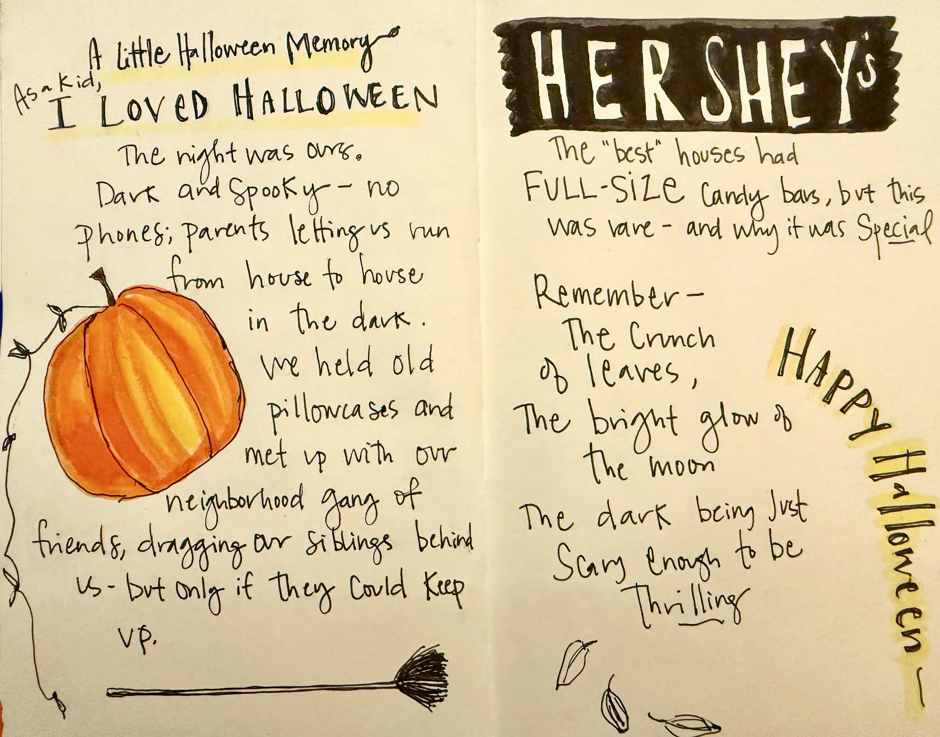 Keeping a visual journal would be a really fun way to mark time. I’m especially proud of my watercolor pumpkins, the tree not so much…why is it so hard to draw a tree?Inspiration this week came from who creates and posts her visual journals and who recently wrote about gathering artists as a “call to action.” Ya’ll, I’m no professional, but I do have colored pencils and crayons.