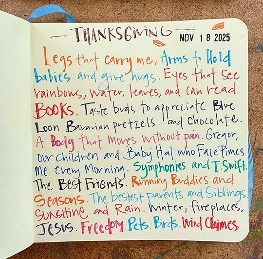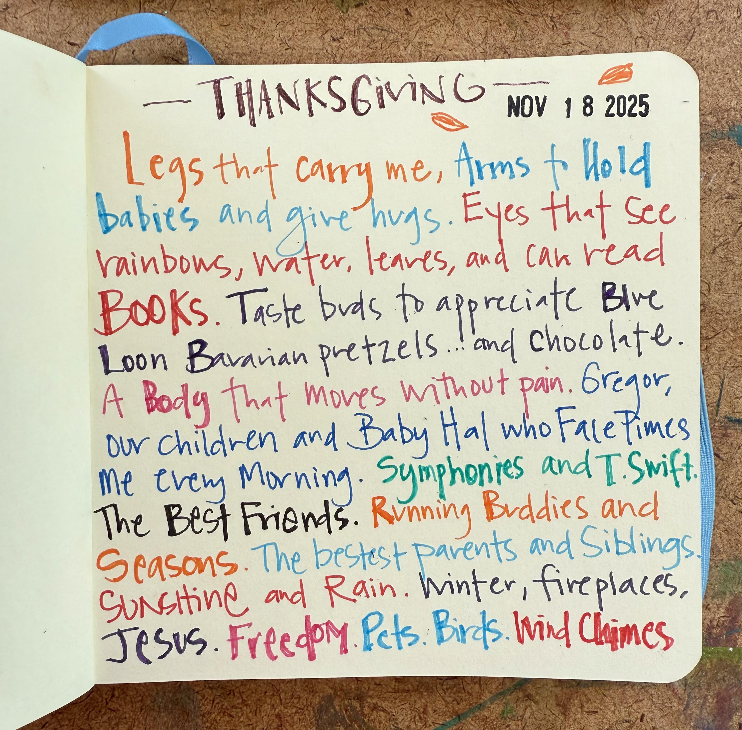 The more thanks I give, the more things flood into my mind. Like right now … fingers that can type, wrists free of carpel tunnel syndrome, a working computer, sunscreen, hair, a warm coat, wind, eggs, and the list goes on and on…and the brain will keep delivering these things the more we focus on all the things.