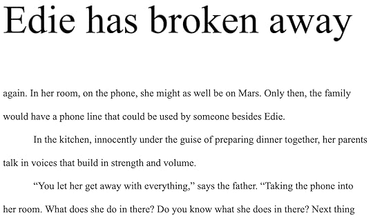 My short story "The Only Thing Louder than the Talking Is the Silence" is in this issue of Tethered. It's online, and it's right here, but also here are the first few words. If you're paying attention to the typesetting, you'll notice it's laid out weird, and if you know me in real life then you probably know this is a pretty good indication that it's a part of a novel I've written, because I always get super aspirational and super layout-geeky on a novel when I write it, and one symptom of this is that the chapters always begin in some dramatic way. Like, say, 48-point font, and then they transition to a regular old font in midsentence. Geez, Matthue, just get published the old-fashioned way and let the designers do their thing.