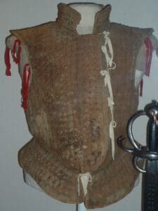 Providing supplies of food, clothing and medicines for the men mustered to fight against the invaders seemed a likely way Roberda might have made her contribution to the war effort in 1587/88. All parishes kept a few items of often outdated armour safely stored in the church against the need to muster. A few lucky men would wear the parish armour; others would have to make shift for themselves. Woollen or leather jerkins would give scant protection. A jack o’plates — a padded jerkin with pieces of metal stitched in — would be much more effective. I needed to know whether women could successfully make such garments.