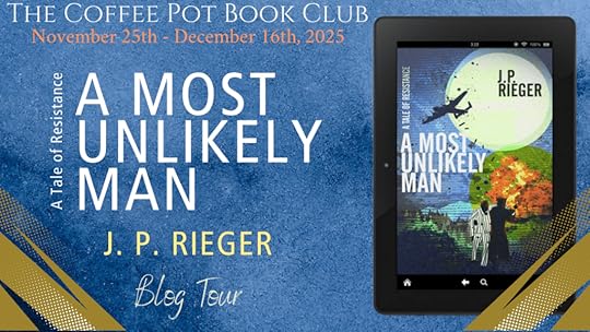 It’s my pleasure to introduce J.P. Rieger as the featured author in The Coffee Pot Book Club Blog Tour being held between November 25th – December 16th, 2025. J.P. Rieger is the author of the Historical Fiction with a touch of Magical Realism, A Most Unlikely Man: A Tale of Resistance, published by Blue Cedar Press on September 23, 2025 (107 pages).